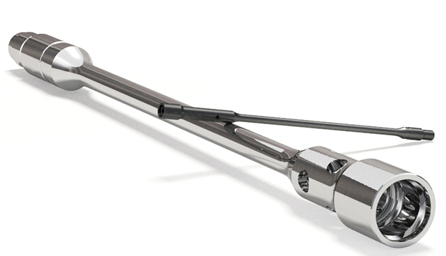 噴吸鉆外形的切削刃交錯分布在精密零件加工鉆頭的兩側,頸部有噴射切削液的小孔,前端有兩個喇叭形孔,切屑在由小孔噴射出的高壓切削液的壓力作用下,從這兩個喇叭形孔沖入并吸出空心刀桿向外排出。