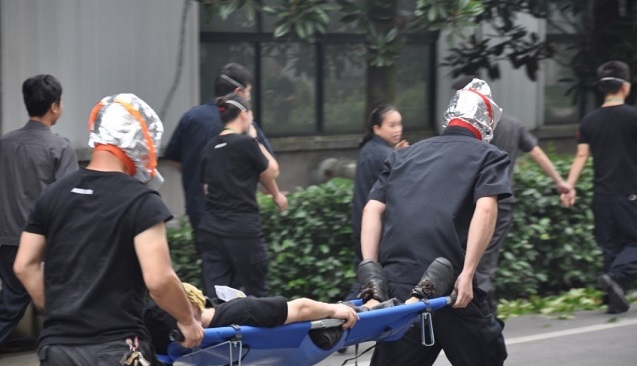 成立搜救小組對廠區(qū)內(nèi)未及時(shí)逃離火災(zāi)的“受傷受困”人員進(jìn)行搜救,經(jīng)過仔細(xì)尋找搜索,成功搜救出一名受困者,用擔(dān)架將其抬出,抬至安全集散地先進(jìn)行初步“搶救”。目的是為了培養(yǎng)員工的搜救技能,以及安全意識(shí)。