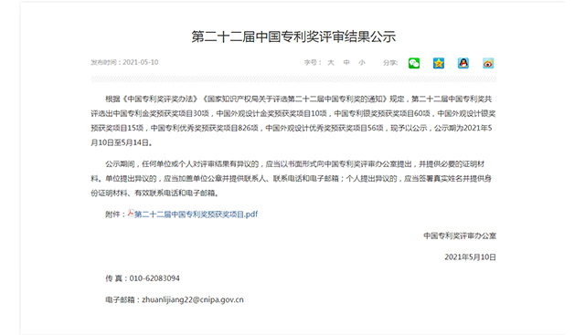 根據《中國專利獎評獎辦法》《國家知識產權局關于評選第二十二屆中國專利獎的通知》規(guī)定,第二十二屆中國專利獎共評選出中國專利金獎預獲獎項目30項,中國外觀設計金獎預獲獎項目10項,中國專利銀獎預獲獎項目60項,中國外觀設計銀獎預獲獎項目15項,中國專利優(yōu)秀獎預獲獎項目826項,中國外觀設計優(yōu)秀獎預獲獎項目56項。