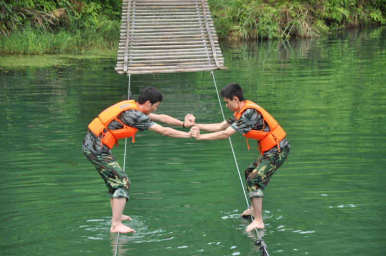 要講到刺激,要說的就是“雙人走鋼絲”了,在湖中設置兩根鋼絲,兩個團隊成員互相攙扶、平衡、配合水中走鋼絲,稍不留意就有落水的風險。既考驗了身體的平衡與柔韌性,更重要的是要有大無畏的精神和勇氣去挑戰(zhàn),展現(xiàn)一個全新的自己。